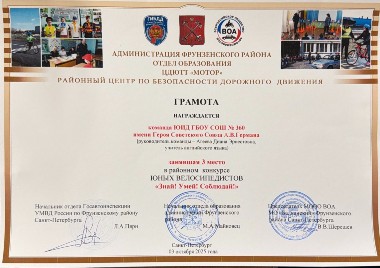 Поздравляем команду нашего отряда ЮИД, занявшую 3 место на районных соревнованиях «Знай! Умей! Соблюдай!». 26 ноября ребята отправились в Отдел Госавтоинспекции по Фрунзенскому району для торжественного награждения и экскурсии.
