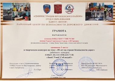 Поздравляем команду нашего отряда ЮИД, занявшую 3 место на районных соревнованиях «Знай! Умей! Соблюдай!». 26 ноября ребята отправились в Отдел Госавтоинспекции по Фрунзенскому району для торжественного награждения и экскурсии.