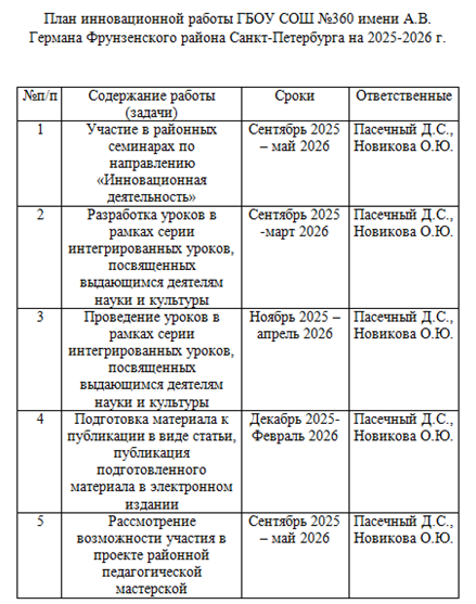 В 2021-22 учебном году инновационная деятельность школы связана с реализацией работы районной проектной педагогической мастерской по теме "Горизонтальное обучение педагогов в условиях непрерывного профессионального роста через альтернативные модели обмена опытом" в рамках кластера "Система профессионального роста педагогов на основе индивидуального образовательного маршрута в ОО". С планом работы районной проектной педагогической мастерской, а также нормативными документами, регламентирующими инновационную деятельность, можно ознакомиться на официальном сайте ИМЦ Фрунзенского района. Режим доступа: https://edu-frn.spb.ru/inno/ 2020-2021 учебный годВ 2020-2021 учебном году инновационная деятельность школы направлена на создание внутришкольной системы профессионального роста педагогов на основе индивидуального образовательного маршрута в рамках сетевого районного проекта "Учитель будущего" С планом работы районной инновационной площадки, а также нормативными документами можно ознакомиться на сайте ИМЦ Фрунзенского района, перейдя по ссылке: https://edu-frn.spb.ru/future/ 2019-2020 учебный годПлан работы по инновационной деятельности ГБОУ СОШ № 360 им. А.В.Германа на 2019-2020 учебный год
